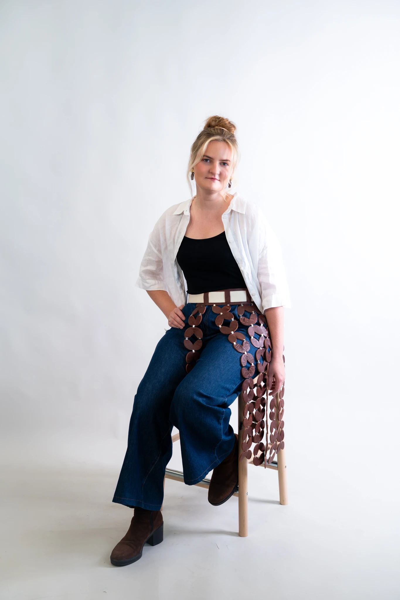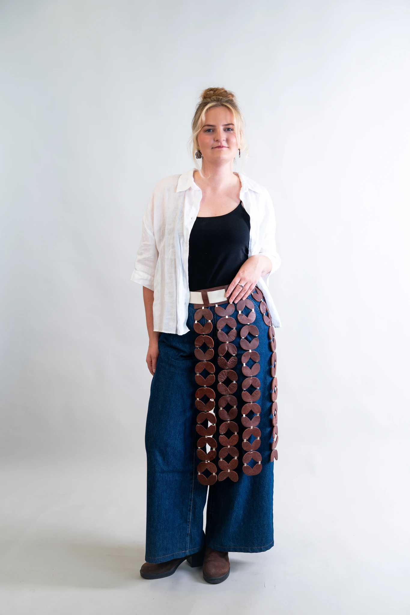 The product details are made of scrap leather. The leaf-shaped pieces are assembled with metal snaps. The belt part of the skirt is attachable and adjustable thanks to the weaving technique. The belt width varies: 6 cm and 4 cm.
