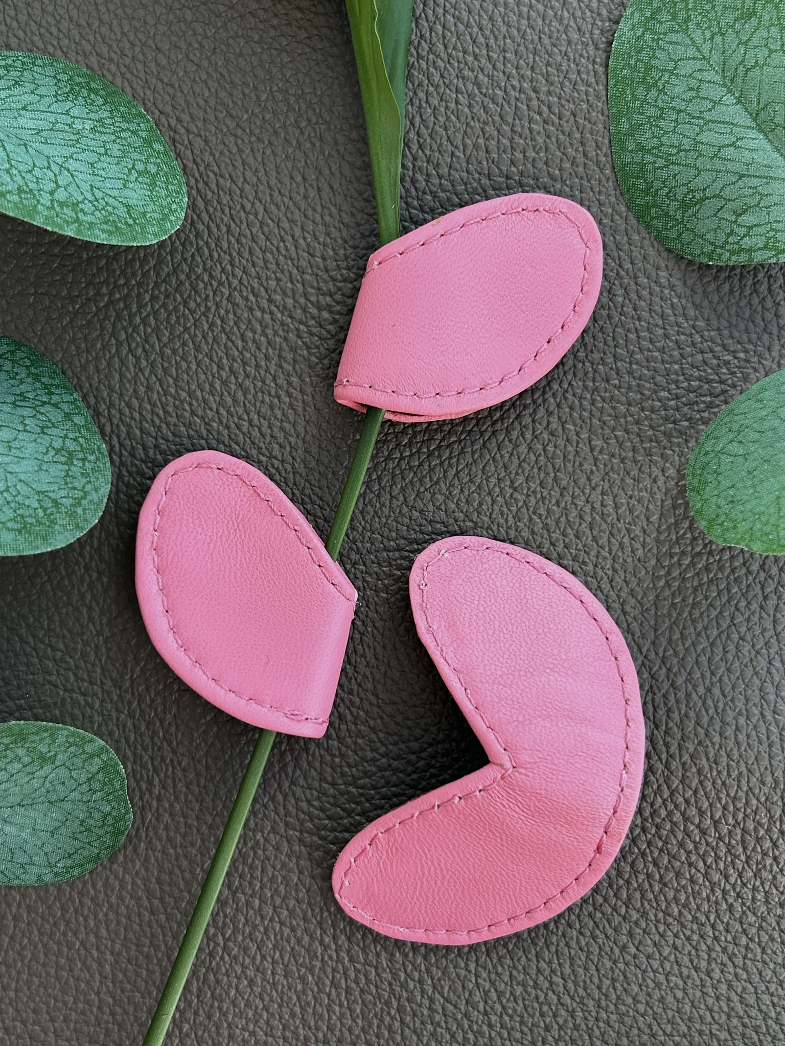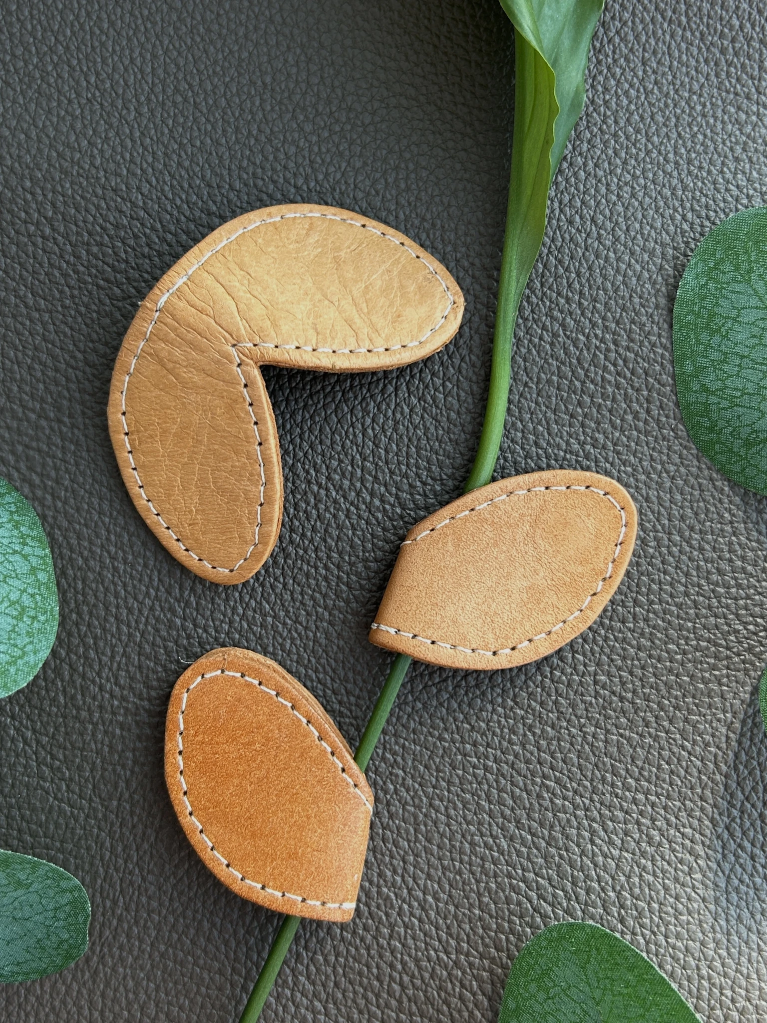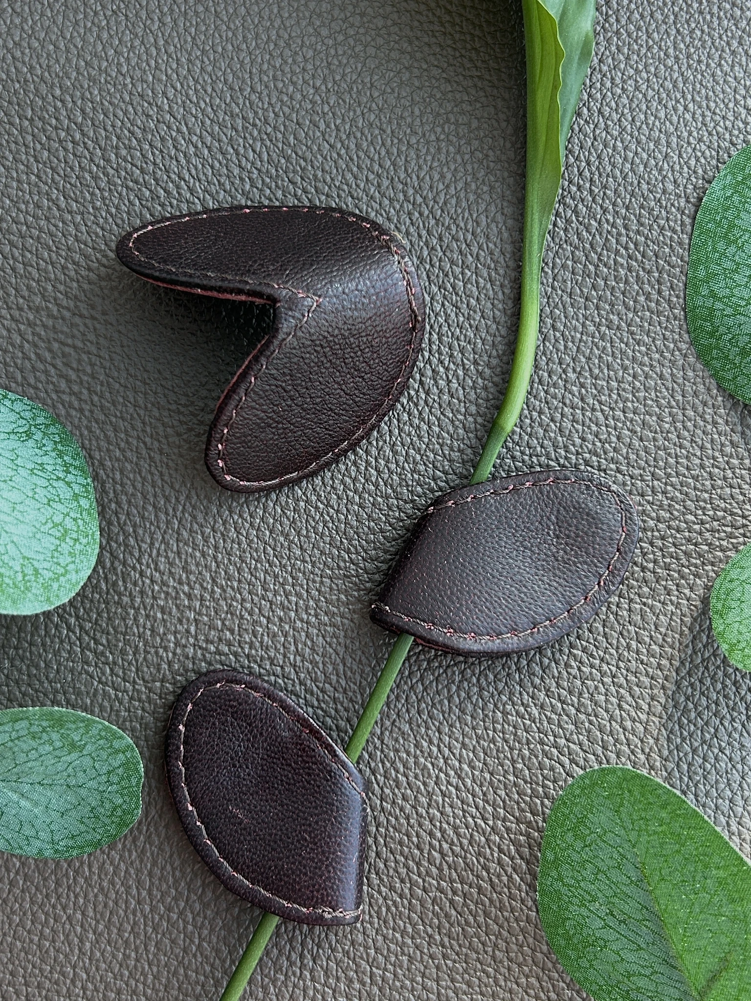 A leather leaf-shaped magnet that can be used as a (book) bookmark, picture clip, hair clip or fridge magnet.