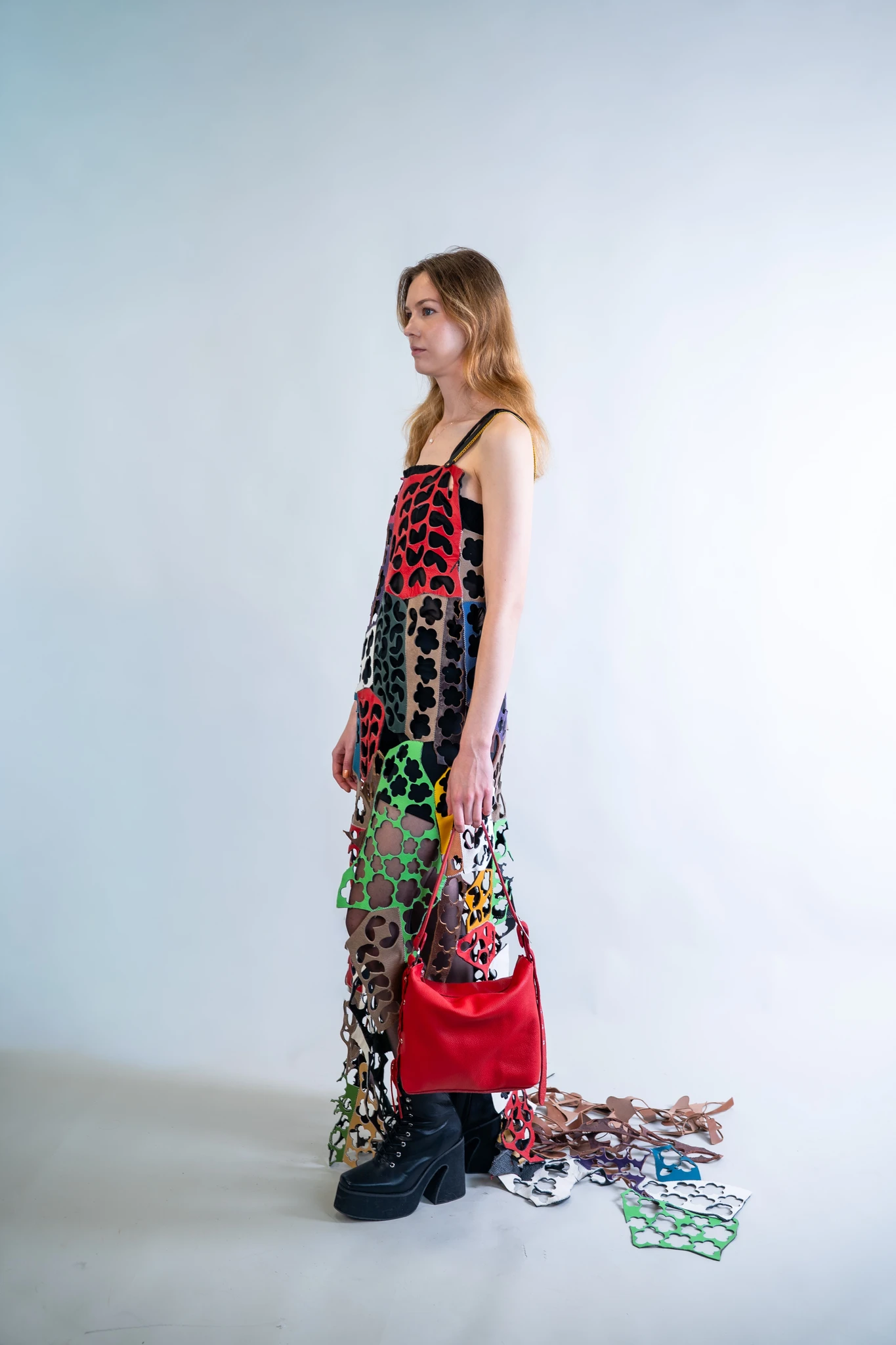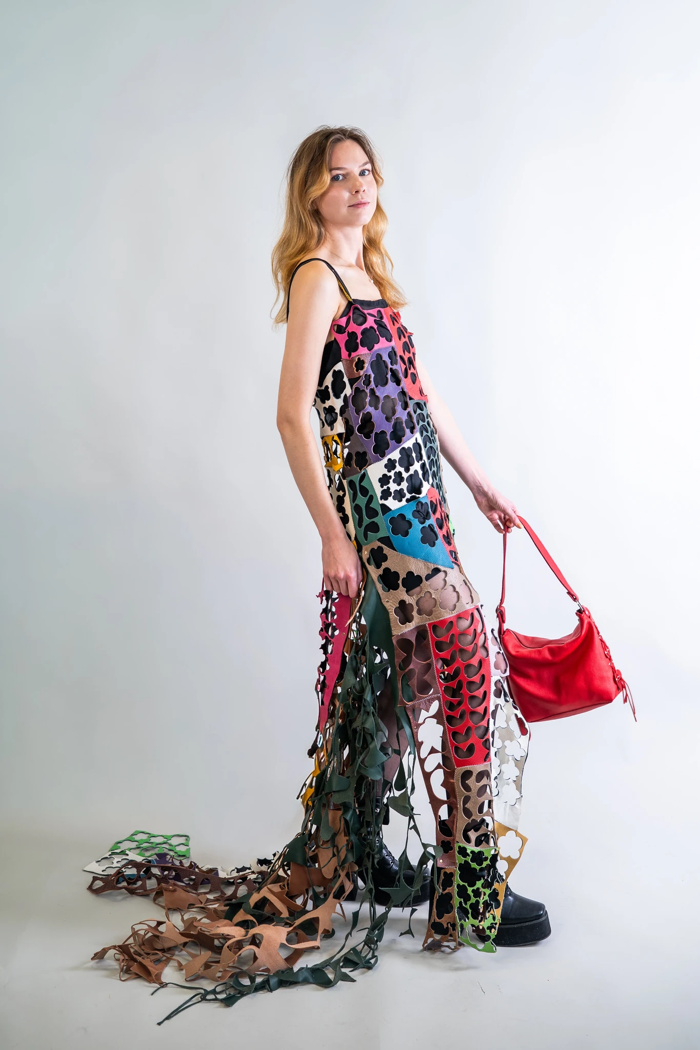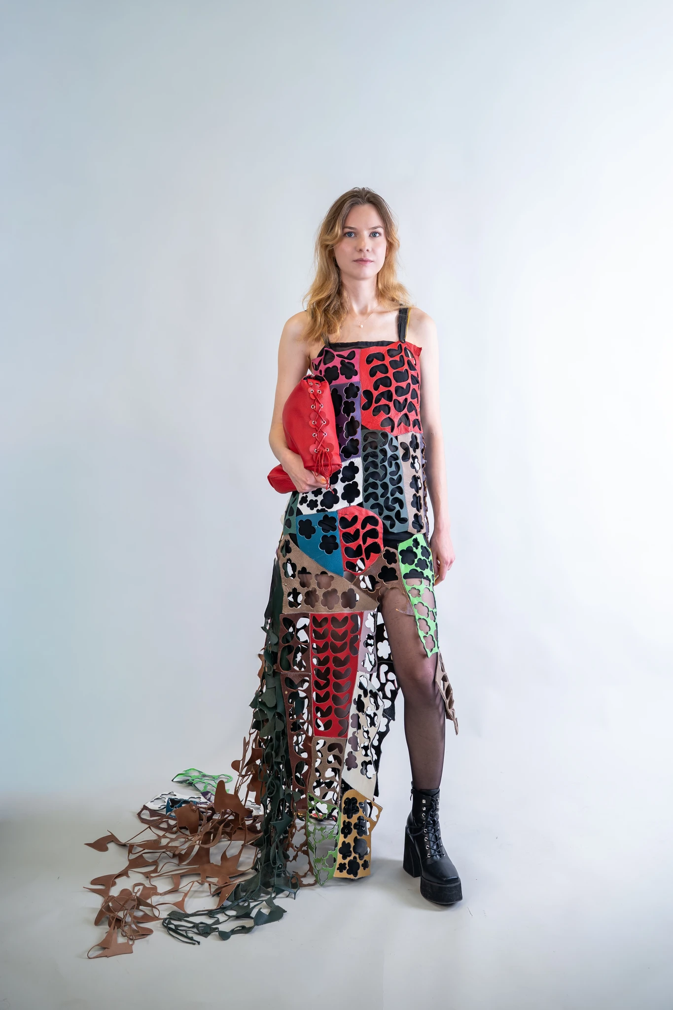 Toode on õmmeldud kokku nahajääkidest, mis on tekkinud lille- ja lehekujuliste tükkide väljalõikamisest. Kleidiga on kaasas eraldi lühikene aluskleit läbipaistvast šifoonkangast.